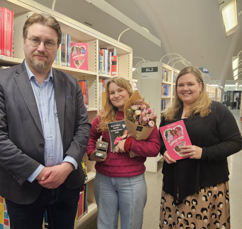 Riina Tanskanen sai palkinnon hänelle mieluisassa paikassa kirjastotalo Metsossa. Palkinnon luovuttivat Kaupunkilehti Tamperelaisen päätoimittaja Petteri Mäkinen ja Tampere Tunnetuksi ry:n puolesta paikalla oli hallituksen jäsen Anu Haalahti Palmrothilta. Kuva: Heidi Kormano